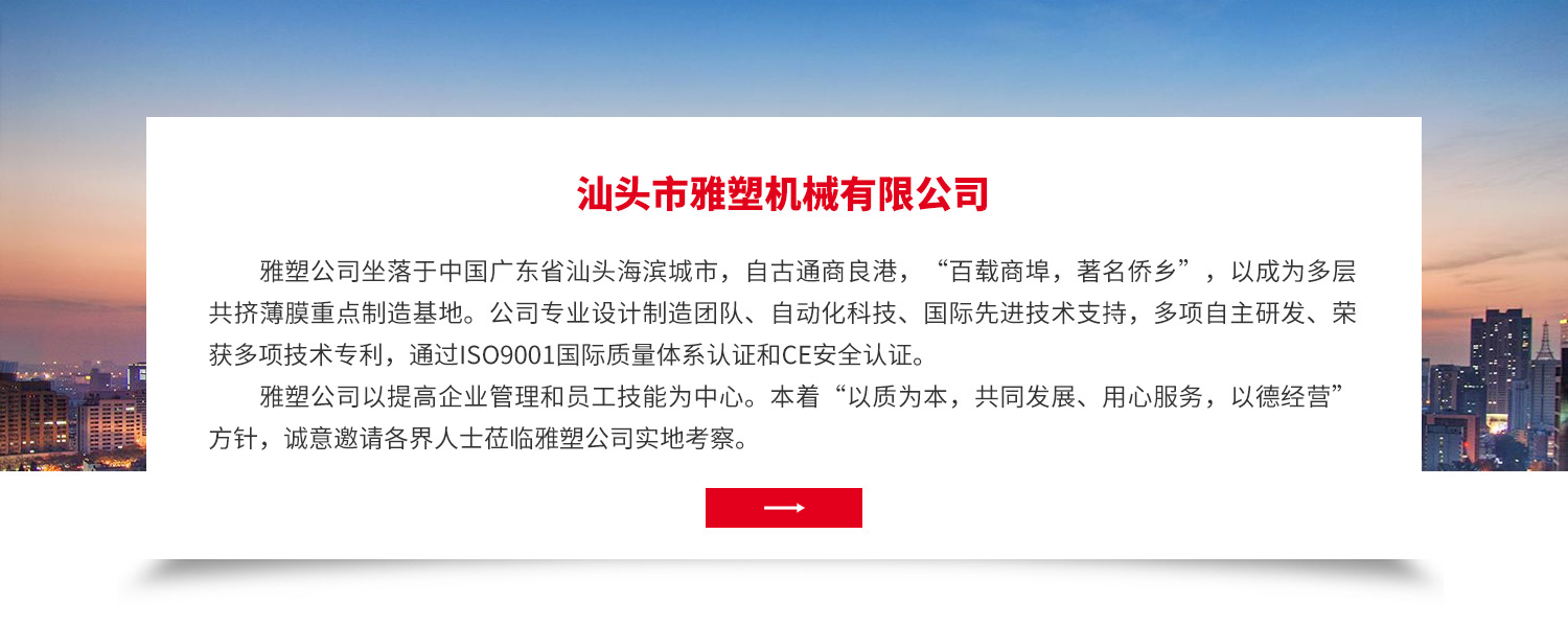 雅塑公司坐落于中國廣東省汕頭海濱城市,自古通商良港,“百載商埠,著名僑鄉(xiāng)”,以成為多層共擠薄膜重點制造基地。